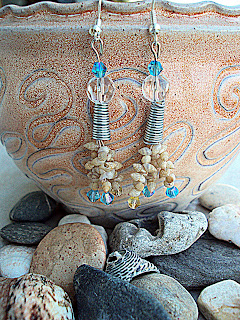 I have a special place in my heart for the sea. For me, the vacation at the seaside has always been the most expected time of the year and the sea never let us down - it gave us the only things that mattered - the sand, blue water and distant horizon. That's why I really wanted to participate in this Sea Breeze challenge. I gathered all my sea treasures - sea shells, beach stones, a walrus tusk and a shark tooth and... several ideas went swirling in my head. I started with what looked like the easiest one (but it took so much time!) - some tiny sea shells from an old necklace (memories, memories!), blue and sandy colored bicones and round glass beads. This is what I made (BTW, I wired the cones on the round nose pliers):