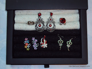 Тази кутия ми беше дадена с... недоумение: "За какво ти е?". Де да знаех! Но идеята мързеливо се оформяше в главата ми и най-сетне придоби ясни очертания една вечер къде 22.30. За пръстени, разбира се! Естествено, въпреки това, че няма къде да прибера запасите си от какво ли не, нямах подходящи материали, но вдъхновението не беше за изпускане и подпуках остатъците от степани пуловери. Изрязах правоъгълници, навих ги на руло и наредих плътно един до друг в кутията. Помогнах си с горещ силикон в началото и в края при навиването, а също и за закрепването към дъното на кутията. Капнах малко лавандулово масло върху вълнените парчета за аромат и предпазване от молци. Ако платът, който имате, не е достатъчно плътен, изрежете правоъгълници от твърд картон и ги увийте с парчетата плат. А историята на съдържанието й ще ви разкажа следващия път :). Ето и един вдъхновяващ източник за такъв проект.