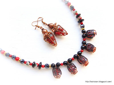 I had promised to post a tutorial for wire wrapped cages (the last picture here) and that's why I started making this necklace. I don't remember what happened but I couldn't take pictures of the separate steps. Apparently, I have to make one more :) I also made a pair of earrings that are not matchy-matchy and make a statement even without the necklace.