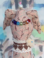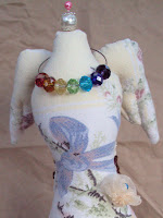 And a lady she is - the Tilda mannequin that Cvety gave me as a Pay it forward gift! This girl never ceases to amaze me - she only started sewing... like... recently and she already gave me two presents and has sewn many more! This lady has two classy faces, whether in a darker patterned dress with laces, a brooch and two organza flowers on both sides or in a pastel dress with a large bow on the waist (it's from the fabric pattern, isn't it cute?). And matching wings because she's an angel :).