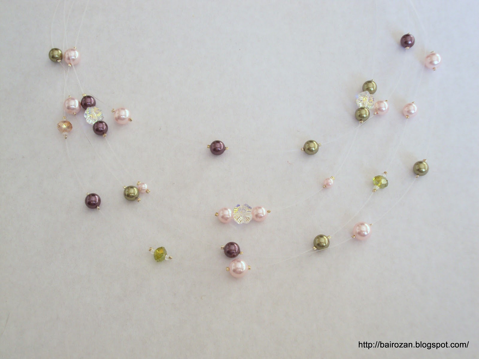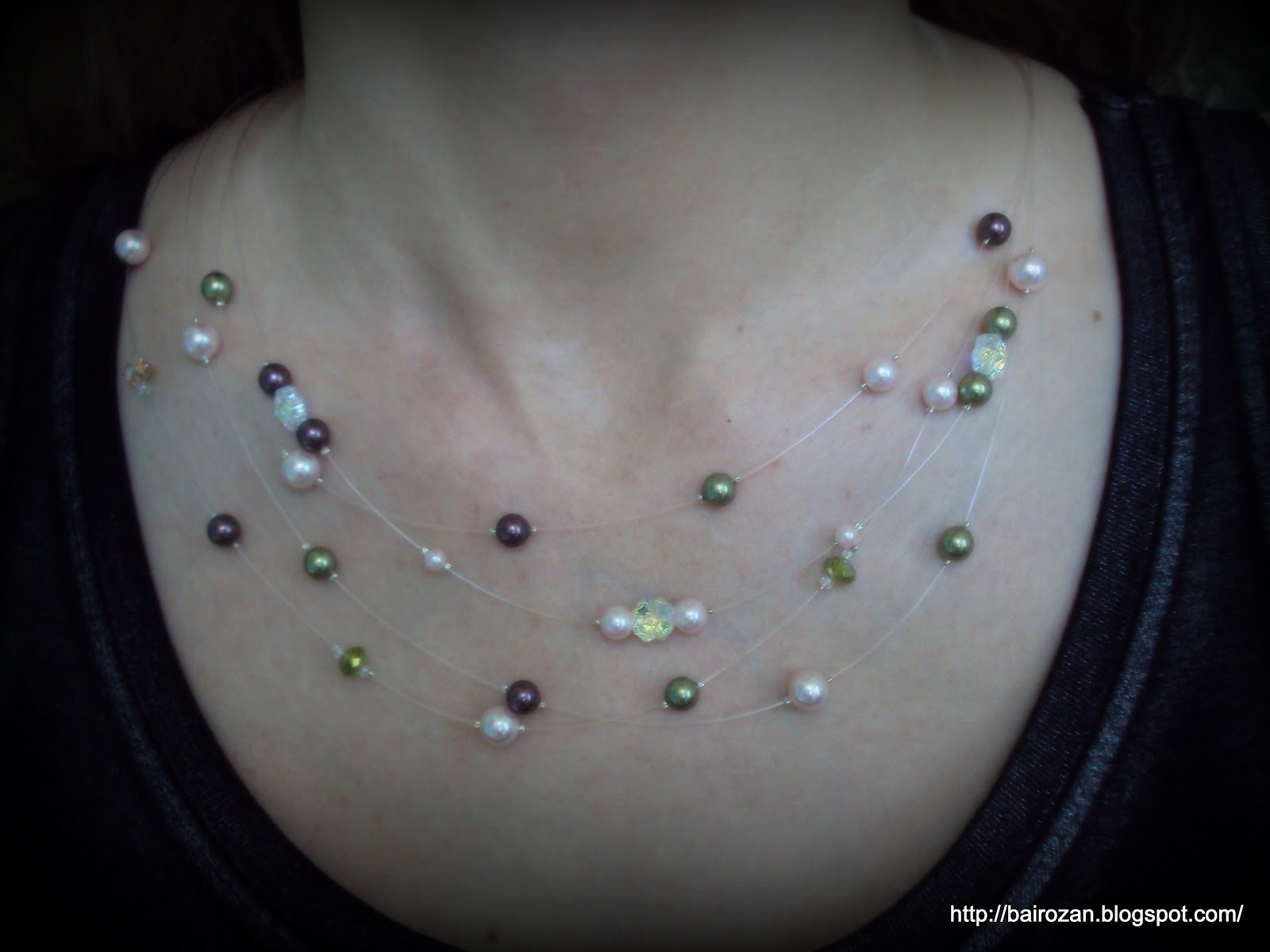 Материалите: кристали Сваровски, перли Сваровски с поне 3 различни размера, прозрачна корда Supplemax, сребърни халкички, сребърни обли сгъваеми накрайници, сребърна закопчалка и посребрени стопчета. Направих един симетричен наниз (ето как) и подредих останалите около него. На вашето внимание - първото ми невидимо колие :)