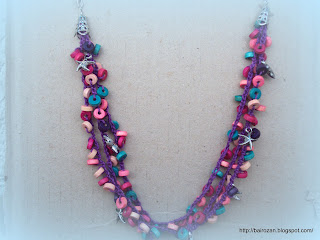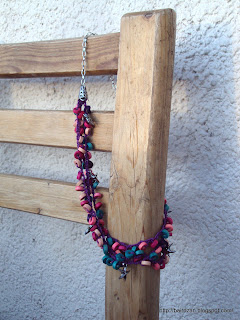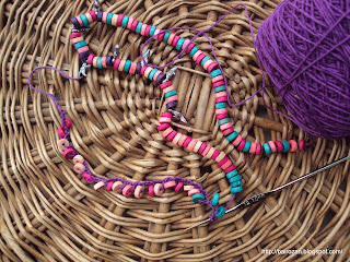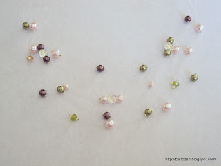 I've been able to manage without a beading board so far but this time I really needed one so I had to quickly invent something. You will need a corkboard or cork hot pad, a piece of soft and thin white material (I used some kind of package cloth), thread and headpins. I'm sure you've already guessed :). First, measure the length of your necklace with the thread. Pin it and start pinning along the beads. It doesn't look very nice but it works. Another option is to string the beads on a beading thread, place the arrangement on the cork pad and secure with pins at both ends of each bead sequence. This will look neater but it's more difficult to rearrange the beads. I used both variants to design the invisible Swarovski pearl and crystal necklace I'd mentioned here.