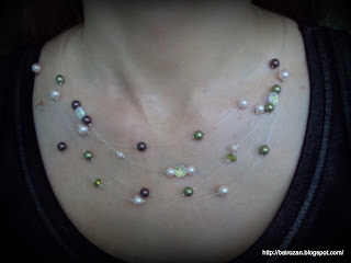 The materials: Swarovski crystals, Swarovski pearls in at least 3 sizes, Supplemax clear illusion cord and sterling silver jumprings, clam shell bead tips, clasp and silver plated crimp beads. I made one symmetrical strand (here is how) and arranged the composition around it. And here is my first invisible necklace :)