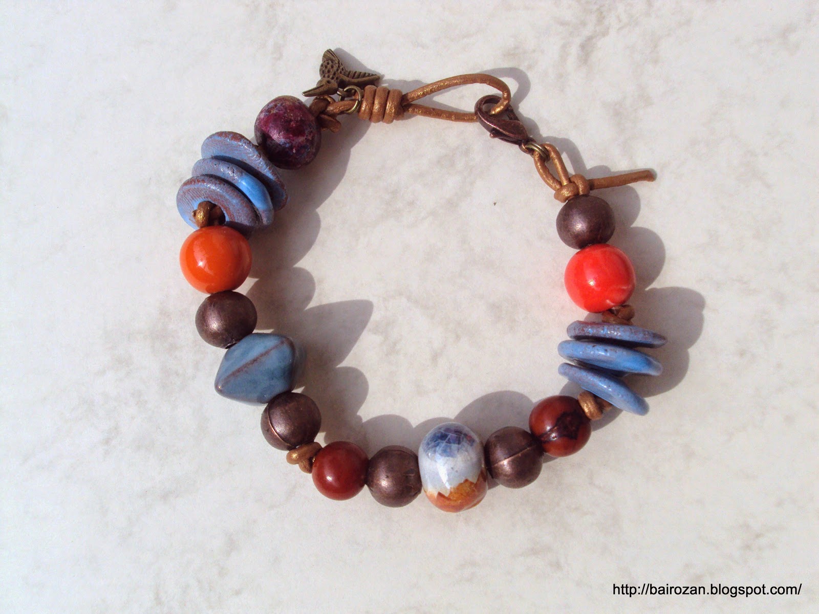 The bracelet was the first thing I made - it shows one of the beautiful beaded beads made by Silvia, some wired blue striped 10-mm agate beads, a Peruvian ceramic bird from TumiFairtradebeads (Etsy) and a ceramic donut from NoName (Sofia, Bulgaria), one lava bead, wire and leather. The wire was soft and these tips came very handy. I also made a pair of earrings with two wired agate beads and the other two mismatched (Like!) beads of Silvia's. "Out of the blue" - because I made it unexpectedly, one day I decided not to worry about having no inspiration at all and take a break, then suddenly went to my working table and started making the wired beads and that was it! And because I feel challenged by the color blue.