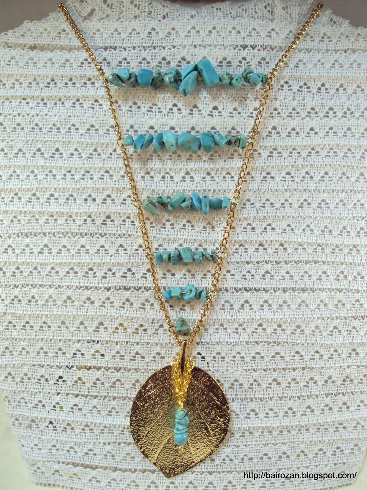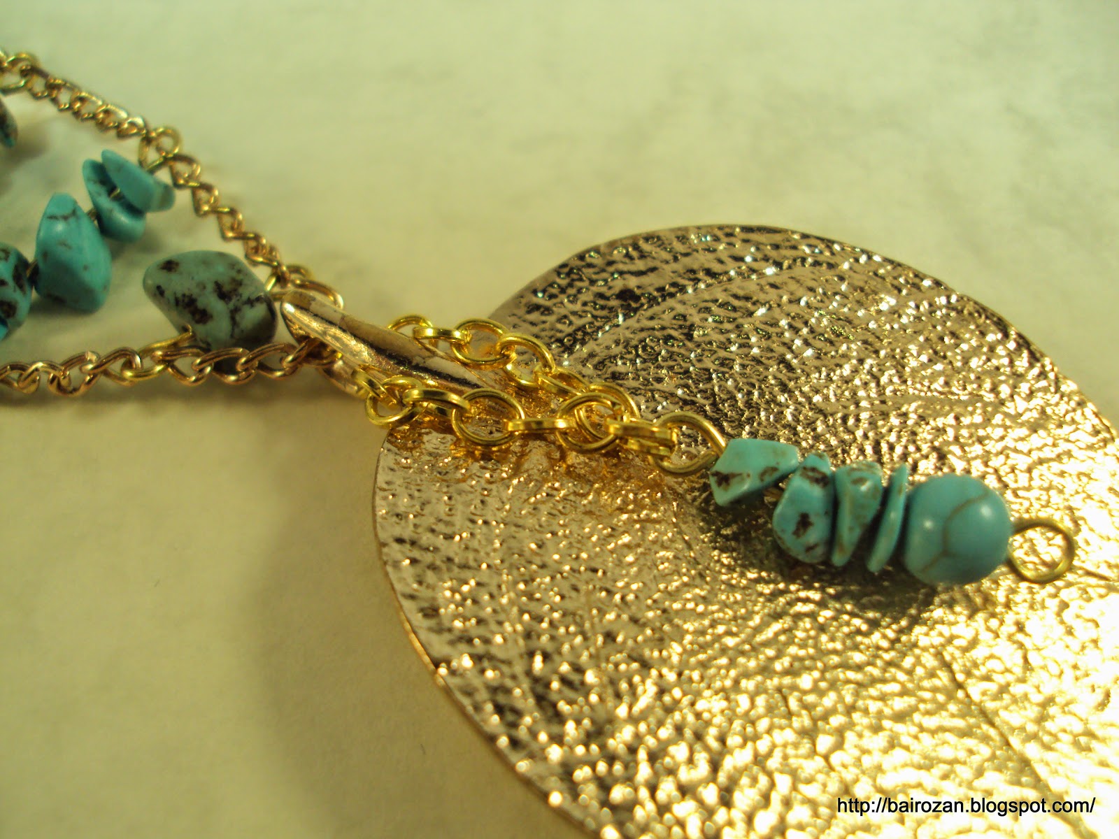 "Златното" колие ме изпоти повече. Нанизах тюркоазен чипс на игли с ушенца с постепенно увеличаваща се дължина и ги подредих над висулката, но не стояха добре докато не съобразих да закача двата края на верижката към всяко ушенце. "Свободния ход" на висулката ограничих с първата много къса игла с ушенца. Блясъкът на листото продължаваше да ме смущава и закачих едно нанизче с тюркоазени мъниста и на него, като промуших къса верижка през държача.