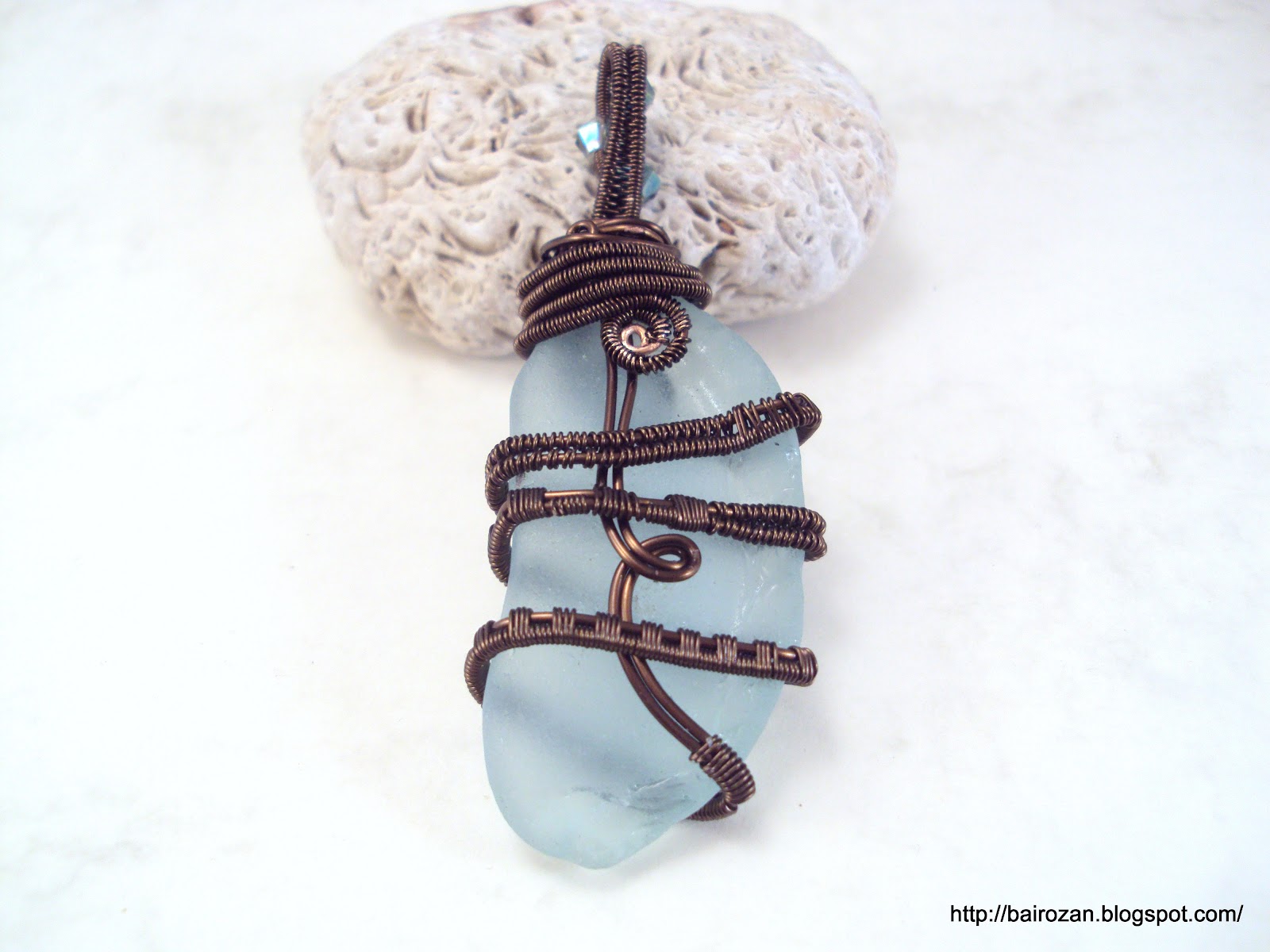 Материали - морско стъкло от Обзор и тел 0.8 мм за основа и 0.4 мм за увиване. Вдъхновение - моят партньор в една размяна на мъниста Шалини Остин, която направи чудо с парченце морско стъкло, което й бях изпратила, вижте сами!